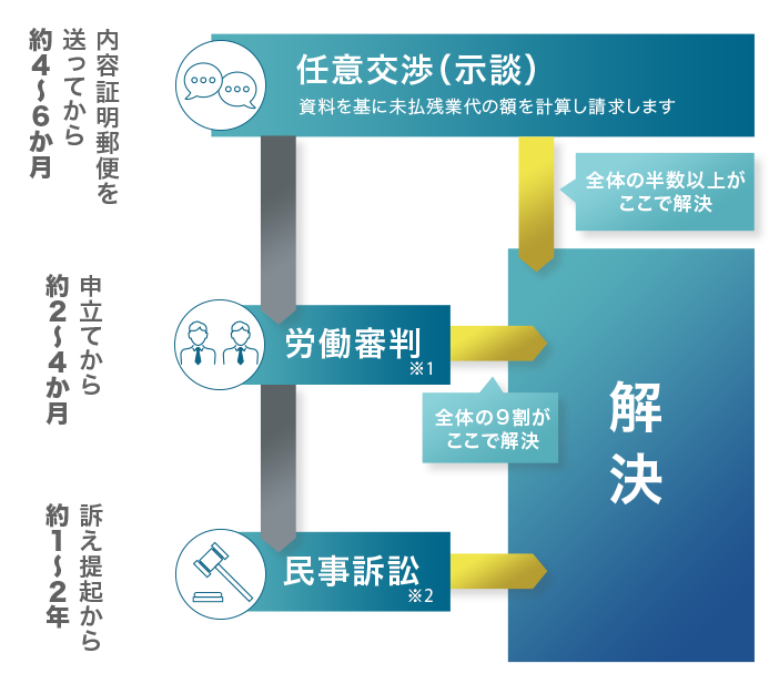 弁護士にご依頼いただければ、最初の交渉段階での早期解決を目指すことができます。個人での対応が困難な労働審判や訴訟に移行した場合でも、豊富な法律知識や高い交渉力をもとにサポート(※)してもらえます。
